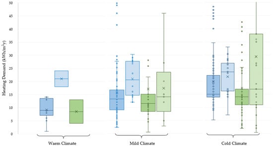 Going into more detail for each climatic zone, the boxplots of Figure 4 show the median value of heating demand of nZEBs according to use of the building (residential and non-residential) and type of construction (new and renovated).