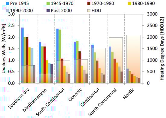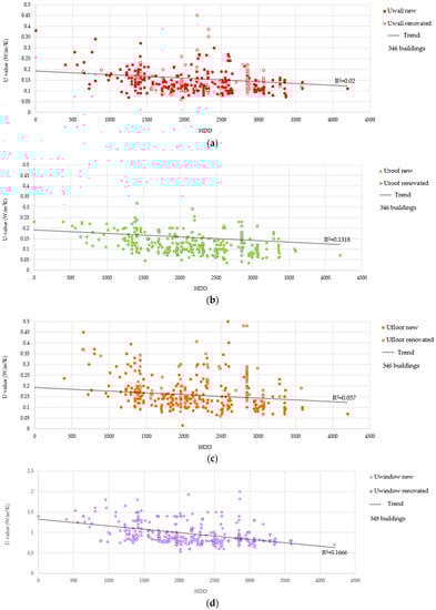 In general, the medium values of wall thermal transmittance are always very low: between 0.12 W/(m2·K) in places with high HDD to 0.20 W/(m2·K) in zones with low HDD. In some cases, the thermal transmittance of external walls are higher than 0.35 W/(m2·K), most of all in buildings located in ‘warm climates’ (HDD < 1000), where the minimum requirements for U-values are less restrictive. Higher wall thermal transmittance values have been observed in renovated historic buildings or in buildings with a particular interest located in the three climate zones, where the envelope performance improvements, (i.e., installation of insulating materials), are limited due to the conservation constraints.
