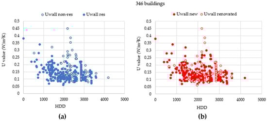 (a) Thermal transmittances of walls of nZEB according to HDD, and in relation to the use of the buildings (residential and non-residential); (b) type of intervention (new and renovated buildings).