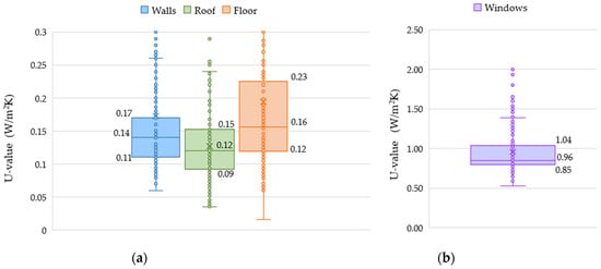 The breakdown for the building elements confirms the general trend identified for the average envelope U-value; in fact, the performances of the building components present a weak correlation with the external climate conditions, as highlights by coefficient of determination (R2). The box plots in Figure 8 show the interquartile ranges (central rectangle) that include the 50% of the “U-values” of each building components. The interquartile ranges of opaque envelope (walls, roofs, and floors) result in being very compact, with median values ranging from 0.12 W/(m2·K) to 0.16 W/(m2·K):
