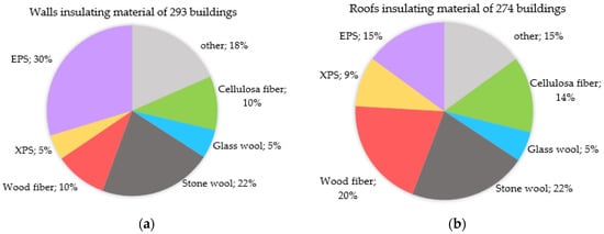 Figure 9 reports the share of insulating materials of walls and roofs. It is remarkable that “EPS” is the most common material used in walls, while “stone wool” is the preferred option for roofs.