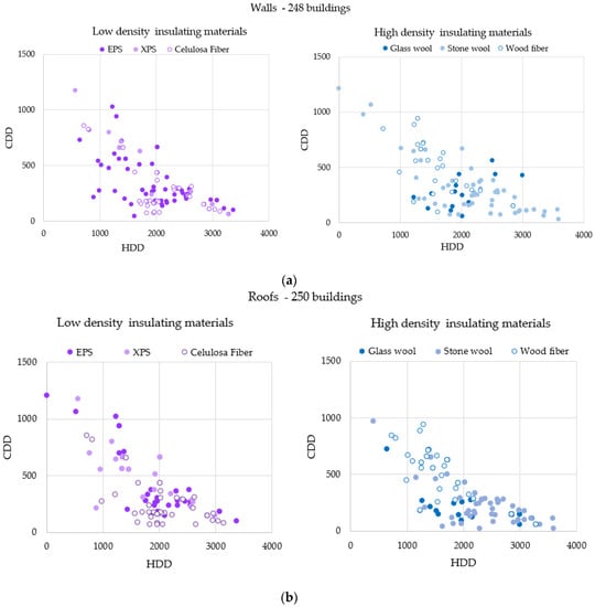 Typology of the most common insulating material used in the walls (a) and in the roofs (b) of noted data nZEBs collected, in relation to the HDD and CDD and according to low and high density of insulating materials.