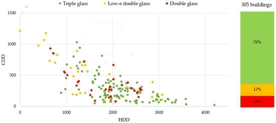 Considering the characteristics of the windows, despite the expectations, we observed that “triple glazing” systems are also applied on buildings located in cooling dominated climates, as shown in Figure 11.