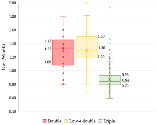 Due to the lack of more specific information concerning the double glass coating (e.g., low emission, selective…), it is difficult to add further considerations. In fact, these glazing systems have similar thermal transmittance, but different windows’ proprieties (e.g., glass emissivity) that can influence the choice of one or other glass according to the building context (orientation, dimension of the windows, building use, etc.). In addition, the lack of reliability of the specific data hinders a more detailed analysis. As it can be seen in Figure 12, the thermal transmittances of triple glass windows are clearly lower in comparison to double and low-e glazing typologies. However, in the case of low emission double glasses, the median of the thermal transmittance is just slightly lower than the median in the simple double glass. For this reason, it can be deduced that, during the data collection, some double-glazing with low emissivity properties were wrongly identified as a simple double glass.