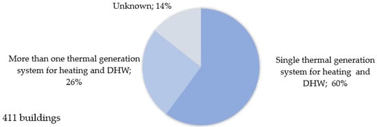 Concerning the different boiler configurations (i.e., combined and separate generation of heating and DHW), around 60% of analyzed nZEBs use one single system for both needs (heating + DHW). On the other hand, 26% use separated thermal systems for heating and DHW, and, for the rest of the sample (14%), there is no information about the used systems (i.e., unknown), as shown in Figure 14.