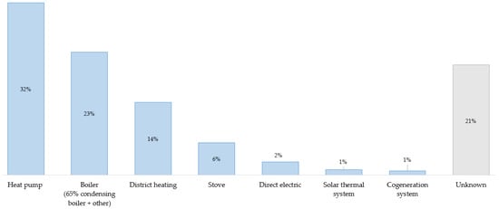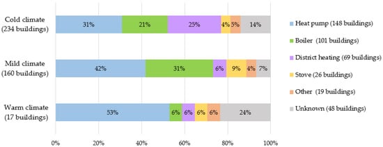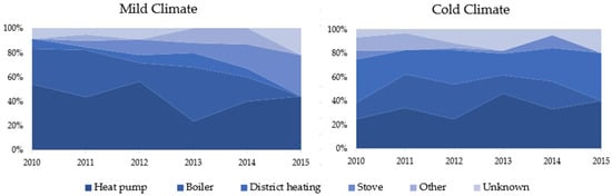 By analyzing the technology adopted during the last years, the trends for the heating systems in different climates highlight a constant use of heat pump systems in mild climates, and a reduction of a boiler system with an increment of stove systems (Figure 18). In addition, it can be noticed that “district heating” is very common in cold climates (normally in North and East Europe), probably because of the longer period, thus investing in this type of infrastructure is more profitable [,]. Nevertheless, political reasons and national strategies could be also behind the high use of district heating in these countries.