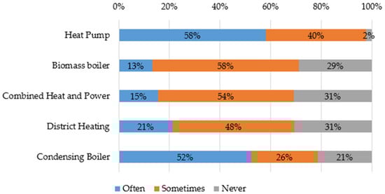 The survey implemented within EU IEE ZEBRA2020 project to building professionals confirmed that “heat pumps” and “condensing boilers” are the most used heating systems, as shown in Figure 17.