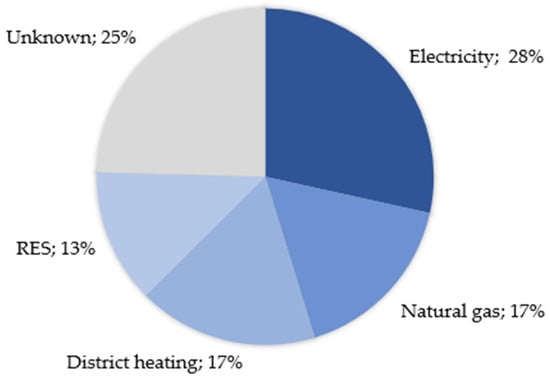 The energy carriers used by thermal systems in the collected buildings can be gathered in four groups: “natural gas”, “district heating”, “electricity” and “RES” (e.g., firewood, wood pellets, wood chips, solar thermal…), as shown in Figure 19.
