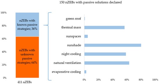 In this regard, the lack of information concerning the usage of passive strategies in the collected nZEBs is a weak point of this investigation. From one side, the missing data depend on the lack of answers due to the open questions used to outline the passive solutions. On the other side, some passive strategies are mandatory in some countries, such as shading systems or green roofs, and, hence, they could not be identified as additional passive solutions in the data sources. Although the high importance for the reduction of the energy demand, only 36% of the collected buildings (150 nZBEs) declared the use of passive strategies, as shown in Figure 22.