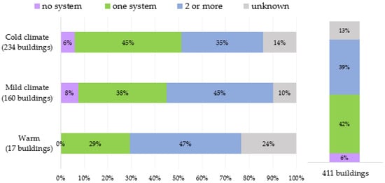 From the results of the analysis, it can be noticed that mechanical ventilation is a recurrent technical solution in new and renovated nZEBs (share of 89%), as shown in Figure 13. This technology is used without any relevant difference in warm, mild and cold climates. Only in 11% of the selected nZEBs, the data information was not declared or not defined during the data collection, for this reason in these cases the results are defined as “unknown”.