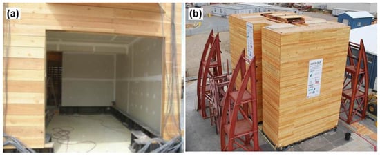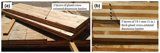 CLT is an engineered wood product made up of cross-oriented layers of dimension lumber, which is either glued or mechanically connected. It was first invented in Austria in the mid-1990s and introduced in the European market shortly afterwards. It was quickly accepted for widespread applications in Europe, particularly in Austria, Germany, and Switzerland. In recent years, it has been gaining popularity in other countries such as Italy, Spain, Norway, Sweden, and the United Kingdom. At the same time it has been adopted for applications outside Europe in North America, Austria, New Zealand, and Japan. Until recently, Australia held the title for world’s tallest CLT building, belonging to the 10-story Forte Apartments in Melbourne, and the list of CLT structures there is growing steadily. CLT has been in production in New Zealand for several years now, and there are already significant examples of applications in seismic regions. Japanese researchers have recently started producing CLT using native Sugi wood, and initiatives to develop code provisions for multi-storied buildings applications are currently underway. At the moment, Canada is leading in applications in North America, with several prominent completed structures and provisions on CLT having been included in the latest revision of the Canadian Standards Association (CSA) O86-Engineering design in wood [20]. The CLT panels themselves behave almost rigidly, and the hysteresis is developed using metal connectors, brackets, and hold downs [21,22]. The technology was developed in Europe almost 20 years ago and is beginning to be used in North America and around the world. No seismic provisions for CLT are available in the U.S. yet, but a project to develop seismic response factors is nearing completion [23], and a handbook for engineering guidance was recently published [24]. Figure 1 presents 3-ply and 5-ply CLT panels. The CLT panels used to retrofit the test building in this study were made of 19.1 mm (0.75 in.) thick spruce dimension lumber.