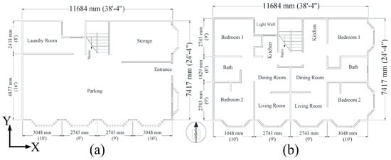 Although the exterior architecture was important for the aspect ratio and determining the locations and number of openings at the soft and other stories, there were several other features of this particular building era that had to be identified, such as interior wall density, room size, nail schedules, floor diaphragm, and flooring details, and of particular note is the lack of hardware such as metal straps and plates, which were not available in this era. The test building plan dimensions were 7.3 m × 11.6 m (24 ft × 38 ft), and Figure 4 presents the architectural plan views of the first story and upper stories (floors 2–4 had the same floor plan).