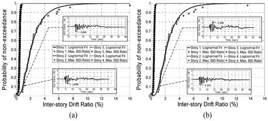 Probability of non-exceedance versus inter-story drift ratio of the four-story building retrofitted in accordance with P-807 guideline using CLT panels: (a) in the X-direction; and (b) in the Y-direction.