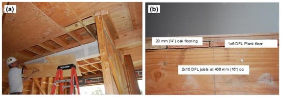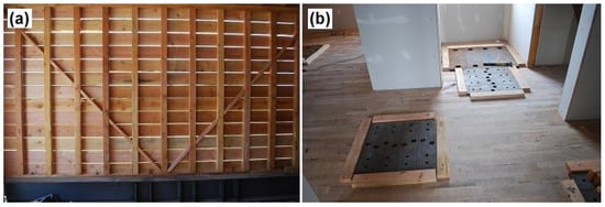 First story diaphragm reinforcement: (a) Installation of plywood panels; (b) Framing of the flooring system.