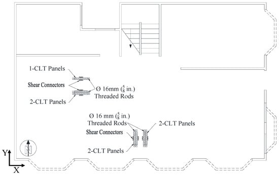 The CLT panels were placed based on basic constraints such as the need to park vehicles after the retrofit and still meet the guidelines of FEMA P-807. Three and four CLT panels were installed along the longitudinal (i.e., X-direction) and transverse directions (i.e., Y-direction) of the building, respectively, as shown in Figure 9. Since the shake table was uniaxial in the X-direction, the three panels rocking in the X-direction provided strength and stiffness, while the four panels in the Y-direction moved the center of rigidity closer to the center of mass, reducing torsion; recall that this is one goal within the FEMA P-807 retrofit guideline.