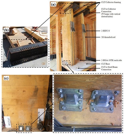 Each CLT line of resistance consisted of two doubled CLT panels. The panels were installed over CLT bases, which were bolted to the steel framing. The transfer of shear forces was accomplished using four HGA-10 KT (Simpson Hurricane Gusset Angle) for each double panel. The transfer of uplift force was accomplished using HDU-8 hold-downs with 1.5 m (5 ft) long mild steel threaded rods designed to stretch and provide the required ductility during rocking. The top of each panel was connected to the floor framing above using a wide flange beam. The web of the beam was connected to the CLT panel using screws, and the flanges were bolted to the collectors through vertical slotted holes.