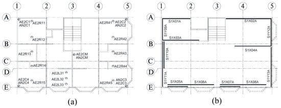 Location of sensors installed in the first story: (a) accelerometers; (b) string potentiometers.