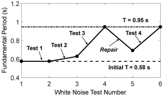 In order to obtain the natural frequencies of the test building prior to and after each seismic test, a white noise test with a root-mean-square (RMS) acceleration amplitude of 0.05 g was conducted. Generally, after each seismic test the fundamental period of the building increased due to damage. Following repairs to the first story of the building, the fundamental period of the building decreased to approach the initial fundamental period of the test building at the undamaged state. Figure 13 presents the fundamental period of the building tracked during four tests.