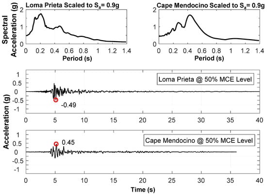 In order to verify the effectiveness of the retrofits under seismic loading, the building was subjected to two different ground motions. The 1989 Loma Prieta-Gilroy (component G03000) earthquake record and the 1992 Cape Mendocino-Rio (component RIO360) earthquake record were selected and scaled to different spectral accelerations for each phase of testing. Table 3 presents the ground motions and their corresponding peak ground accelerations (PGA) and spectral accelerations for each phase of the test program. Figure 14 presents the spectral accelerations for the Loma Prieta and Cape Mendocino ground motions scaled to Sa = 0.9 g and the acceleration time histories of the ground motions scaled to the 50% MCE level (i.e., Sa = 0.9 g). For scaling the ground motions, 22 bi-axial far-field earthquake ground motion records of the FEMA P-695 [29] were used. Each ground motion consisted of a pair of horizontal ground motions in the X- and Y-directions. A SRSS (square root of the sum of the squares) spectrum was constructed by taking the SRSS of the five percent-damped response spectra of two components of each pair of the horizontal ground motion components. Each pair of ground motions was scaled such that, in the period range from 0.08 to 1.5 s, the average of the SRSS spectra of all pairs of components did not fall below the site design spectrum. This period range represented 0.2 times the period of the stiffest retrofitted building to 1.5 times the period of the un-retrofitted building based on the numerically predicted periods. For the generation of the design spectrum in the San Francisco Bay Area, the spectral response accelerations at short periods (Ss) and at a period of 1.0 s (S1) were 1.8 g and 1.2 g, respectively. It should be noted that the building was retrofitted in both the X- and Y-directions to withstand bi-axial ground motions and satisfy the performance criteria (i.e., translational and torsional responses); therefore, the bi-axial ground motion scaling procedure consistent with ASCE 7-10 was used even though the shake table was able to produce excitation in the X-direction only.