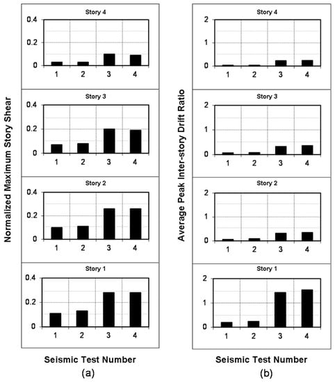 Behavior of the building over its height for each seismic test: (a) Normalized maximum story shear ratios; (b) Average peak inter-story drift ratios.