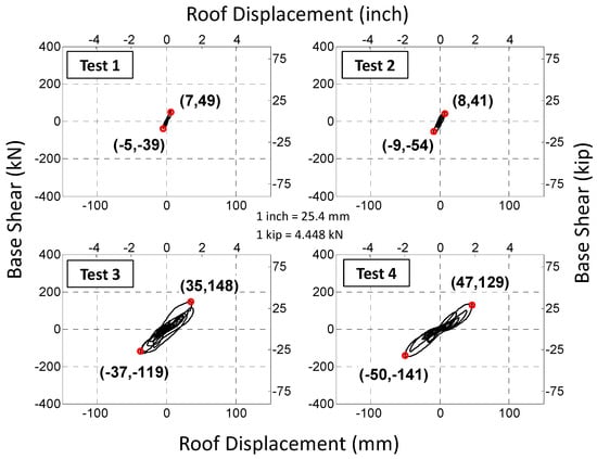 The inertial force at each floor diaphragm was calculated by applying Newton’s second law by using the spatial average of the acceleration time histories recorded at each corner of the stories and the mass associated with each story. The shear force at each story was then calculated for all seismic tests. Figure 17 presents the global hysteresis of the building, which is defined here as the roof displacement versus the shear force at the base of the building (i.e., base shear) for all four seismic tests. It should be noted that the global hysteresis are close to a diagonal line extending from the first to the third quarter and are relatively smooth (i.e., without spike). This behavior was expected since the FEMA P-807 retrofit tends to concentrate deformational response in the first (soft) story, thereby limiting the contribution of higher modes.