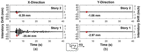Translational response of the building retrofitted with CLT panels and subjected to Cape Mendocino-Rio ground motion with peak ground accelerations (PGA) = 0.45 g: (a) X-direction; (b) Y-Direction.