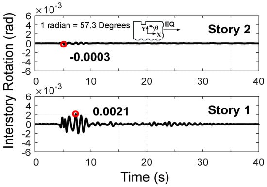 Inter-story rotational responses of the retrofitted building measured at the 1st and 2nd stories subjected to Cape Mendocino-Rio ground motion scaled to Sa = 0.9 g.