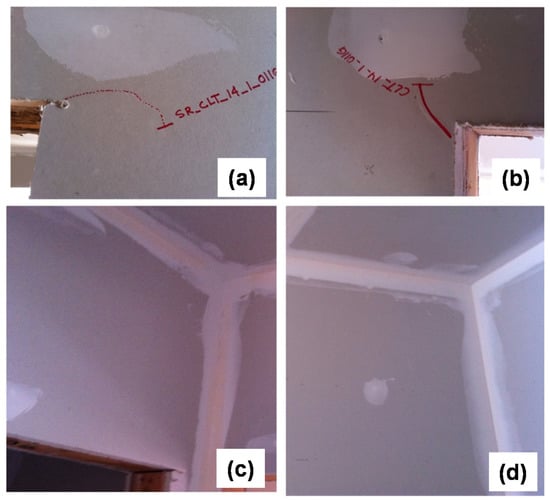 Typical damage observed in (a,b) diagonal cracks in the drywall at the first story; (c,d) no damage at upper stories (third story).