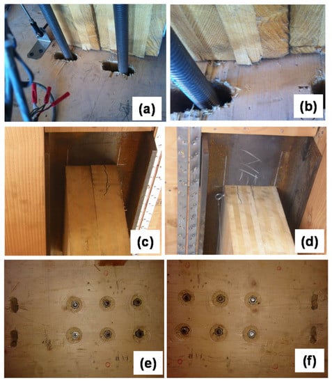 Damages at the CLT walls after tests: (a,b) minor splitting near the base; (c,d) cracks at the top of walls; (e,f) no damage to the bases.
