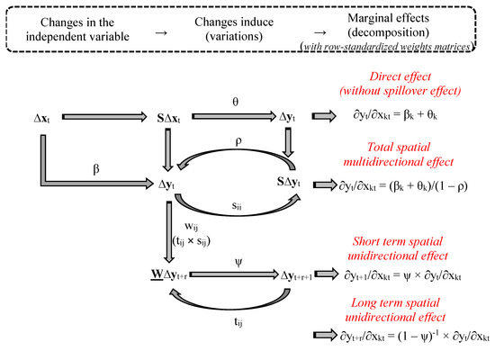 However, an additional effect appears: a dynamic temporal effect, as measured by the coefficient ψ. Thus, considering the SDM specification (Equation (9)), the total marginal effect can be extended to calculate both the short-run (Equation (13)) and the long-run (Equation (14)) total marginal effects.