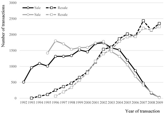 The pairs of transactions used in the analysis consider 6 years before the opening of the first station of the new mass transit system. In the case of the south-east CRT, the database includes transactions from 1995 until 2009 (Table 1), while in the case of the north CRT, transactions run from 1992 until 2009 (Table 2). In both cases, the number of transactions in the grey shaded part of the tables indicates houses that may experience a change in mass transit supply between sale and resale. These data are considered to form the treatment group, while transactions occurring both before and after the change in mass transit supply are considered to form the control group. The main idea of the DID, SDID, and STDID estimators is to use these treatment and control groups to infer the possible effect related to the opening of new CRT stations.