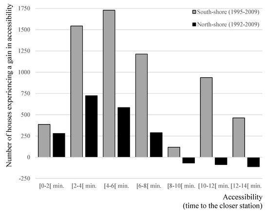 - Dubé, J.; Thériault, M.; Des Rosiers, F. Commuter Rail Accessibility and House Values: The Case of the Montréal South Shore, Canada, 1992–2009. Transp. Res. Part A 2013, 54, 49–66. [Google Scholar] [CrossRef]
