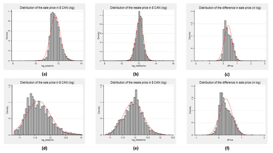Distribution of the sale and resale price according to the logarithmic transformation among samples: (a) Distribution of (first) sale price for the south-east corridor; (b) Distribution of (second) resale price for the south-east corridor; (c) Difference between resale and sale price for the south-east corridor; (d) Distribution of (first) sale price for the north corridor; (e) Distribution of (second) resale price for the north corridor; (f) Difference between resale and sale price for the north corridor.