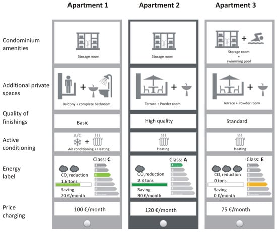 From its origin until today, choice experiments (CE) have been seen as a way to study a system of implicit values when choosing an option within a finite set of alternatives []. CEs consist of making a group of individuals undertake a task in which they are faced with the choice, among a finite set of alternatives, of their preferred option (usually a product or service). These alternatives are usually referred to as “the choice set” and, from a cognitive point of view, their comparison (followed by the final choice) represents the task that the respondent is called to accomplish. Each alternative is made up from attributes (e.g., number of bedrooms in an apartment, or the EL) and there are different levels for each attribute (e.g., 1, 2, or “A”, “B”, “C” rankings). So, this technique allows to: (a) detect which attributes are more relevant for the potential or actual users; (b) identify the preferred levels inside each attribute; (c) analyse the interaction between different levels; and (d) simulate the preference for a new project.