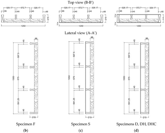 As mentioned, within the process of development and characterization of a new kind of prefabricated timber panel, an experimental program composed of five tests on single timber panel walls has been carried out. This experimental campaign comprised four tests under monotonic loading and one with the application of cyclic loading. Different sheathing layouts were studied and distinct fixation solutions to the base were evaluated. All panels used presented the same internal structure, 1250 mm by 1950 mm (see Figure 1a), composed by two longitudinal elements of 65 mm × 215 mm and two transversal ones (one on the top and another at the bottom) of 45 mm × 215 mm. Inside this external frame, an internal grid is made by means of two transversal elements of 45 mm × 120 mm and two longitudinal elements of 45 mm × 95 mm. All elements are screwed with SCH RothoBlass® screws of 6 mm, their length being 120 mm or 160 mm if placed in the internal grid or in the external frame, respectively. The first specimen evaluated (F) consists in this timber structure without any kind of sheathing and fixed to a concrete base with steel rods (see Figure 1b). Then, the second specimen considered (S) had an 11 mm OSB panel in one side (see Figure 1c). The third (D) had one 11 mm OSB panel in each side of the structure (see Figure 1d). Both specimens kept the same fixation to the base through steel rods. The fourth specimen (DH) was similar to the third (see Figure 1d), the timber frame structure sheathed in both sides by an 11 mm OSB panel, but now two HTT22 hold-downs from Simpson Strong Tie were used to fix the panel to the base. Finally, the fifth specimen (DHC) was equal to the fourth (see Figure 1d) and was tested under a cyclic loading. Table 1 presents a summary of the test program that was undertaken, with a description of each specimen, the fixation to the base used and the loading protocol applied, while Figure 1 presents the specimens and their main details.