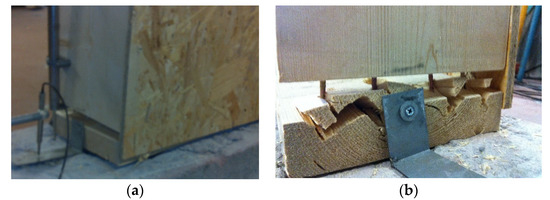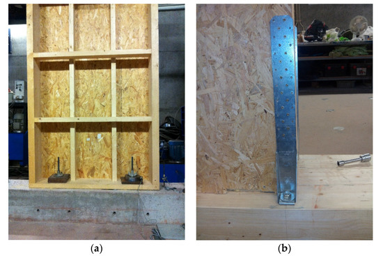 As part of the feasibility studies of multistory light-frame timber buildings, research efforts focusing on the seismic design aspect were responsible for the shift to performance-based design (PBD) of these structures. This shift entails accurate models of wood-frame buildings under seismic loading that need to be developed. For this to happen, a fully mechanistic or constitutive understanding of the individual components, sub-assemblies, and their interaction to form a complex structural system is required. In the last few years, various experimental research has been conducted to assess the behavior of different timber-based systems under in-plane horizontal loads [8,9,10,11], and through full-scale shaking tests following different peak acceleration values [3,12,13,14,15,16]. Those experiments have been crucial for the development of different analytical and numerical models to represent the response of different timber-framed walls and buildings [17,18,19,20], making it possible to enlarge the value of the findings through different parametric studies [21,22]. In the particular case of light-frame shear walls, past research has shown that the sheathing material [23,24,25,26] and the type of fixation to the base used are important variables in the local and overall behavior of such systems under lateral in-plane loads. It is expected that with the presence of the sheathing material and its stiffness, the load-carrying capacity and the stiffness under in-plane horizontal loads will increase. Additionally, the stiffness of the fixation to the base of the timber-frame walls plays an important role. With a high stiffness, the sliding movement of the wall under lateral loading is then substituted by rocking. Despite this evidence, there is a lack of studies about the influence of the sheathing material and on the type of fixation to the base. In fact, some variability can happen on-site with the sheathing material. For example, the use in only one side for construction reasons (technical openings, the use of thin gypsum, etc.) with unknown consequences on the light timber-frame wall response. The same questions arise with the type of fixation to the base. Different types of connectors can be used, with distinct levels of technical information available depending on the brand or manufacturer, but in some cases, the old steel rod is used to fix the timber-frame wall to the base. It is clear that more studies are needed to support the decisions of the builder and of the designer.