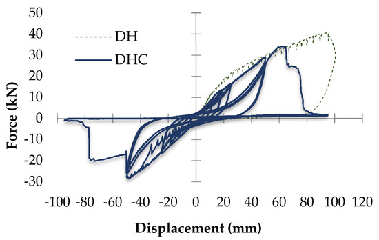 Specimens DH and DHC are similar to specimen D, but now hold-downs were used to fix the panel to the base (timber). The cyclic loading of specimen DHC procedure was defined in accordance with EN 12512 [27] and by using the elastic displacement value obtained from the DH test, as both specimens are identical, with the loading protocol as the only difference. Figure 11 shows the experimental force-displacement loops obtained during the DHC test and the DH monotonic test.