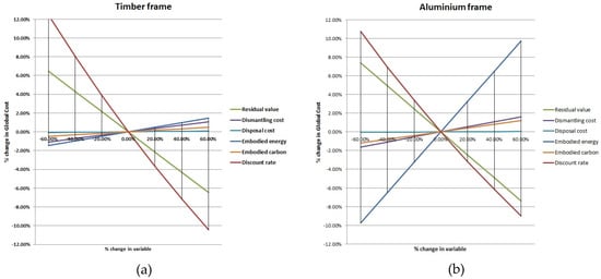 Sensitivity analysis: spider graph: (a) Timber frame; (b) Aluminum frame.