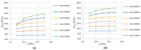 Figure 3. Bending moment of collapse (MRd,B) vs. concrete strength (fc) and axial force (Ned). (a) Cross section A (40 × 40); (b) Cross section B (40 × 70).