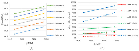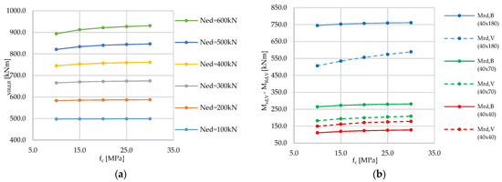 Figure 4. (a) Bending moment of collapse (MRd,B) vs. concrete strength (fc) and axial force (Ned)-cross section C (40 × 180); (b) bending (MRd,B) and shear mechanism (MRd,V) vs. (fc) with Ned = 400 kN-cross section (A–C), with Ned = 400 kN.