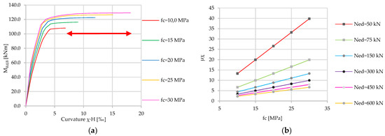 Figure 5. Bending moment (MRd,B) vs dimensionless curvature χ(hs) varying concrete strength (fc)-cross section A (40 × 40), Ned = 400 kN (a); curvature ductility μχ vs. concrete strength (fc) and axial force (Ned)-cross section A (40 × 40) (b).