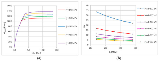 Figure 7. Bending moment (MRd) vs. dimensionless curvature χ(hs)varying steel strength (fyd)-cross section A-(40 × 40), NEd = 400 kN (a); curvature ductility μχ vs. steel strength fy and axial force (NEd)-cross section A-(40 × 40) (b).