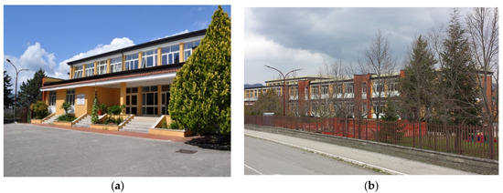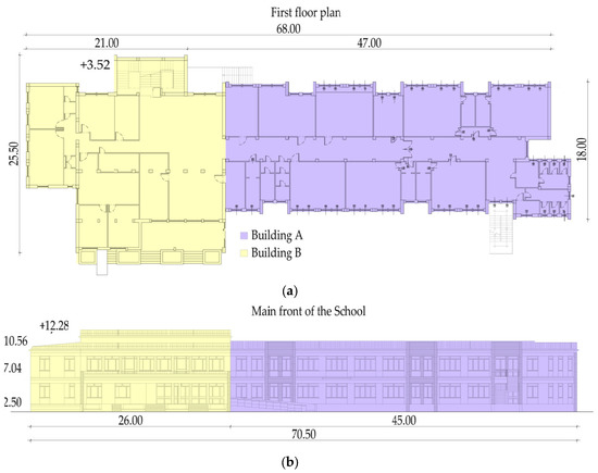 Figure 9. Main views of the school: Front entrance building B (a); building A (b).