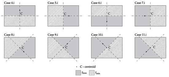 The European seismic code [20] generally considers in-plan irregularity throughout the eccentricities of the equivalent seismic forces. Also, non-uniform distribution of the columns material in r.c. buildings can produce torsional effects [24,25,26,27]: hence the definition of “material eccentricity” em. Conventional analyses on existing buildings generally consider uniform materials by assuming an average value obtained from an experimental test. Taking into account the material variability, even just for columns, produces a sensitive variation in the response of the model both in nonlinear and linear analyses. In this paragraph, the eccentricities of stiffness and of strength, deriving from the material eccentricity are illustrated.