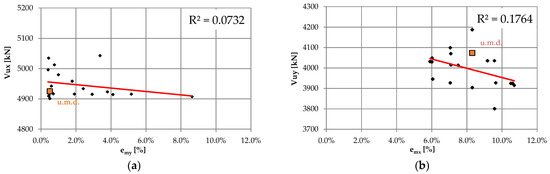 Figure 13. Linear regression Vu - em for building B. x direction (a); y direction (b). u.m.d. indicates the uniform material distribution case.