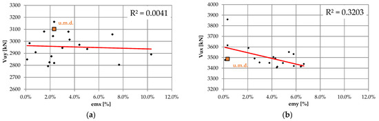 Figure 12. Linear regression V u e m for building A. x direction (a); y direction (b). The orange square with the label u.m.d. indicates the uniform material distribution case.