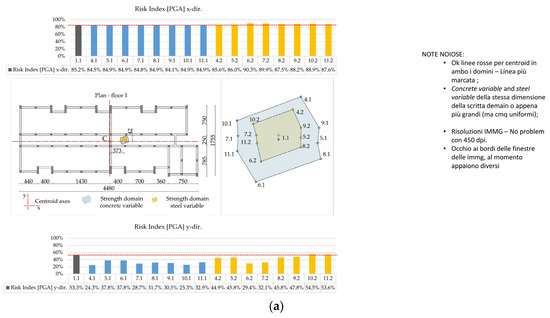 It is well known that linear analysis furnishes more severe Risk Indexes IR than the non-linear one, as also shown in the benchmark model. It is also relevant to point out that irregular material distribution in the plan also produces torsional effects also for a symmetric building such as the benchmark building; that occurs in both analyses, due to strength eccentricity. Moreover, it is important to observe that IR and the ultimate shear strength of the columns are not influenced by the local variation of strength in LA or NLA as suggested by Eurocode 8 [20]. It is a consequence of their dependence only on the average mechanical properties of the columns. In other terms, material eccentricity involves torsional modes [27,30] as well as a geometric eccentricity but this aspect is not discussed in the current Standards [20]. The multimodal and adaptive pushover appear the most suitable methods to consider torsional effects here induced [31,32]. A comparison of the traditional model with uniform (u.m.d.) and the model with non-uniform material distributions (n.u.m.d.) in the benchmark example highlights that: