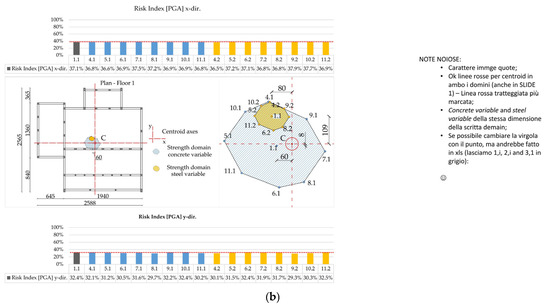 Figure 14. Strength domain of building A (a) and B (b). At the top and at the bottom is the change rate of the risk index IR in x and in y directions (units in cm). C is the centre of mass of each storey.