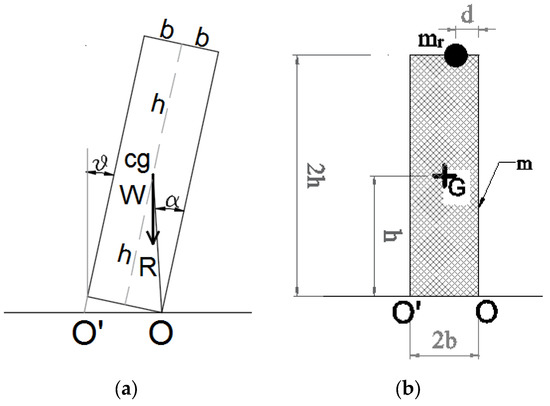 The equation of motion governing the rocking phenomenon of a free-standing rigid block is analogous to that used for investigating the response of a free-standing block with additional mass. A mass placed at the top of the block could simulate a roof mass, whose effect is one of changing the centroid of the composed system block + mass (Figure 1b). Thus, the inertia moment accordingly changes, with multiple values of radius and slenderness, but the equation of motion is basically the same as that of Housner’s model (see Section 3) [17].