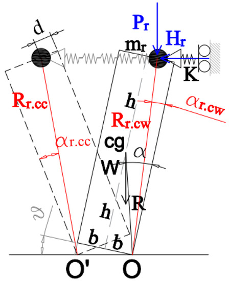Due to the eccentricity of the roof mass, the radius vector changes depending on the rotation sign, R r . c w for clockwise and R r . c c for counterclockwise rotations, respectively (Figure 2, [17]). However, for slender blocks, the difference between R r . c w and R r . c c is negligible, and the radius vector can be assumed as the double of the radius vector R .